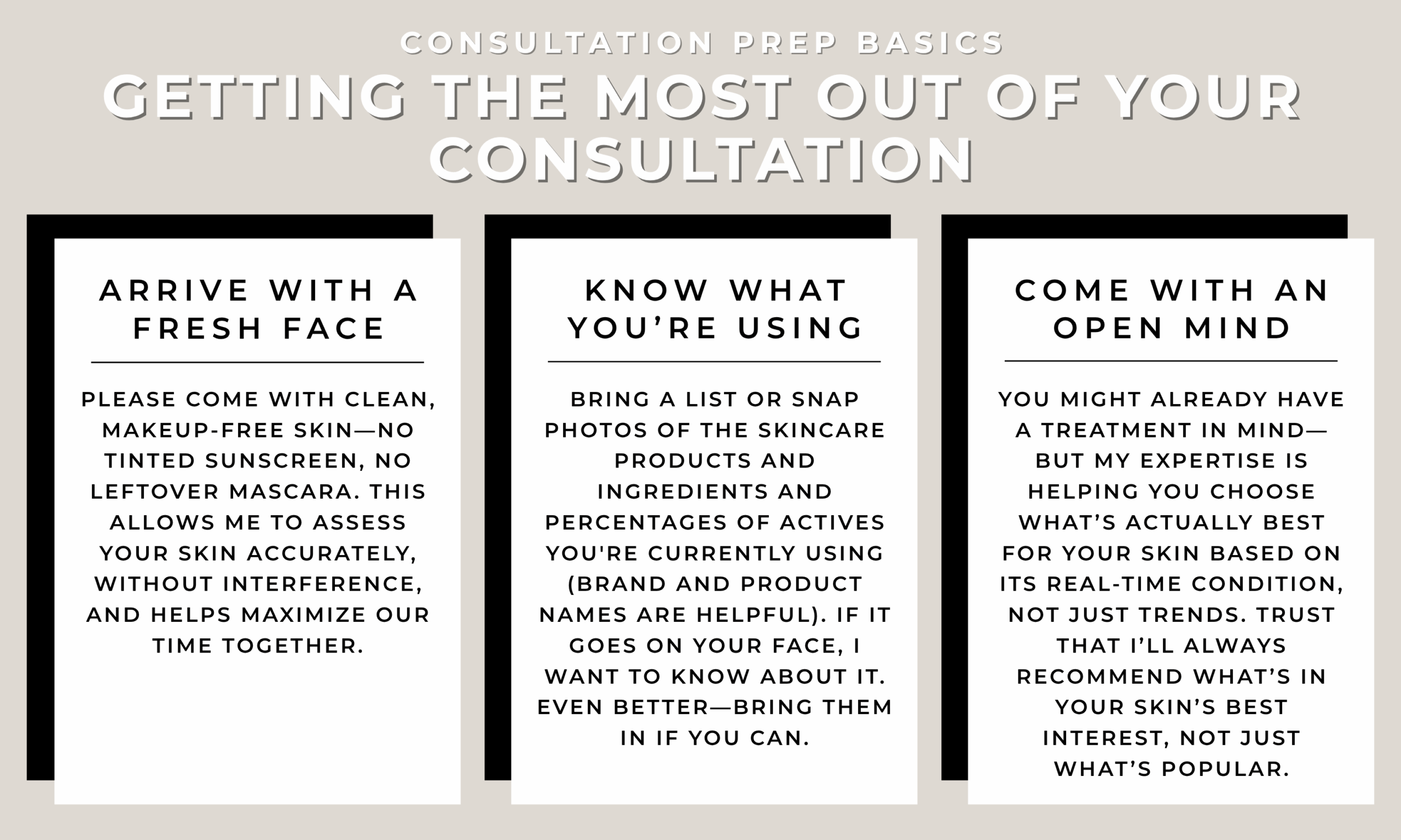 *Please bring a list or photos of your current skincare, supplements, and medications. Not just the names and brands, but the ingredients, strengths, etc. Transparency here helps us guide you accurately.